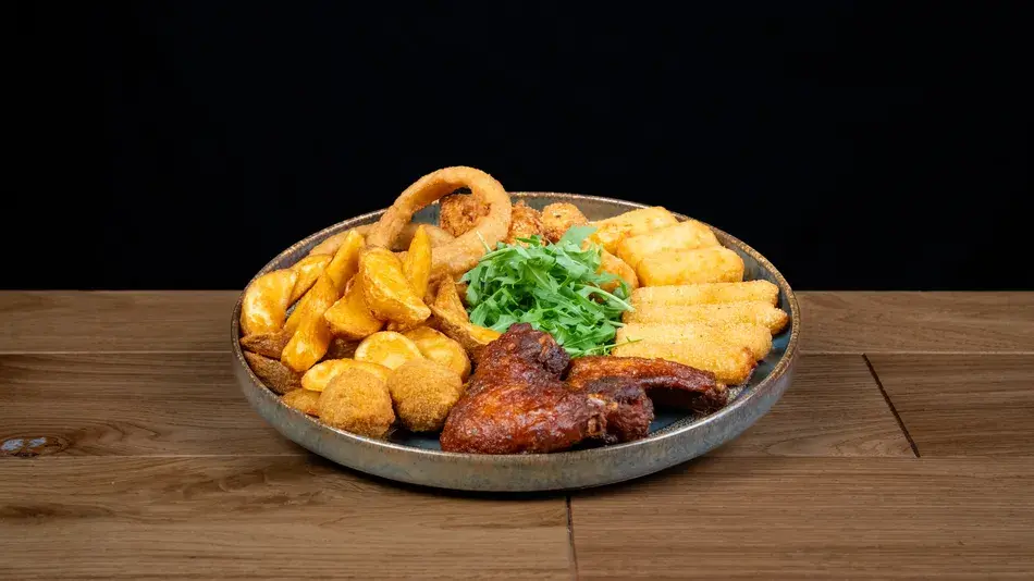 Alette di pollo speziate, anelli di cipolla, mozzarelline panate, nuggets di pollo dorati, olive ascolane, crocchette di patate, patatine fritte.