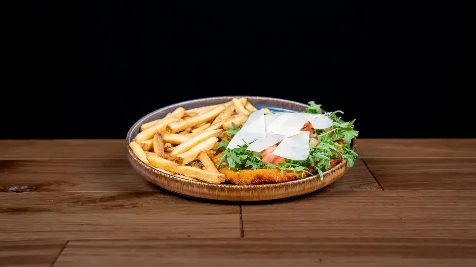 Cotoletta maxi di maiale, panata e dorata, croccante fuori e succosa all’interno. La stessa cotoletta, con rucola fresca, scaglie di grana e pomodorini. Quando la luce filtra nel varco, tutto diventa più chiaro.
