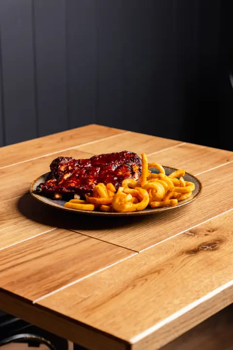 Costine di maiale cotte a bassa temperatura, glassate in salsa BBQ, morbide fino a cedere al primo morso. Quando il vuoto si apre, la carne non oppone resistenza. Servite con: Patate tagliate a ricciolo, con panatura speziata al chili e paprika