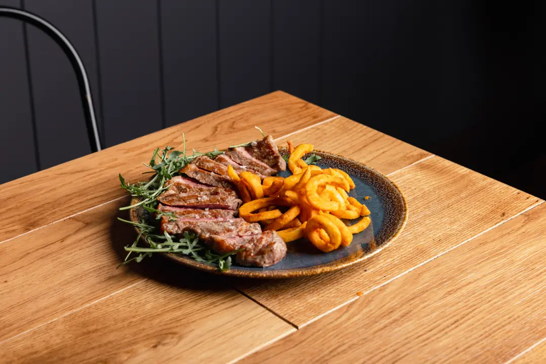 Tagliata di controfiletto di manzo (300 g) alla griglia, cottura netta e precisa per mantenere succosità e carattere. È il punto esatto in cui tutto è ancora sotto controllo. Un passo oltre… e non si torna indietro. Servito con Patate tagliate a ricciolo, con panatura speziata al chili e paprika.