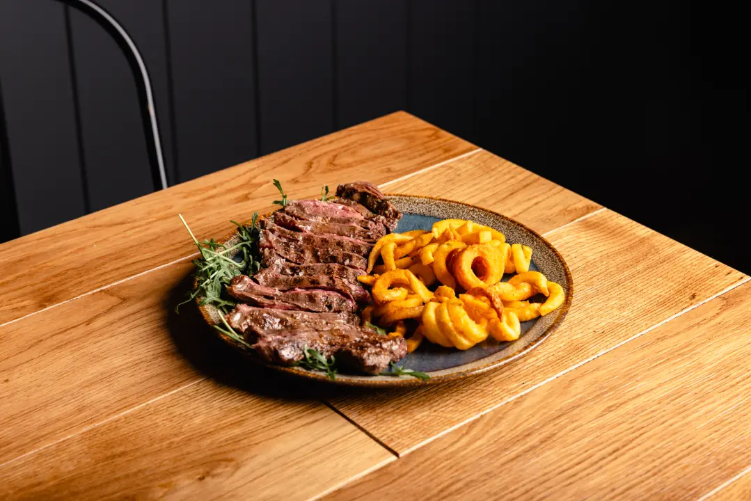 Diaframma di manzo Scottato (300 g) e grigliato ad alta temperatura, fibra decisa, sapore profondo, morso che lascia il segno. Quando la linea si spezza, non resta che attraversarla. Servita con: Patate tagliate a ricciolo, con panatura speziata al chili e paprika CONSIGLIATA LA COTTURA AL SANGUE.