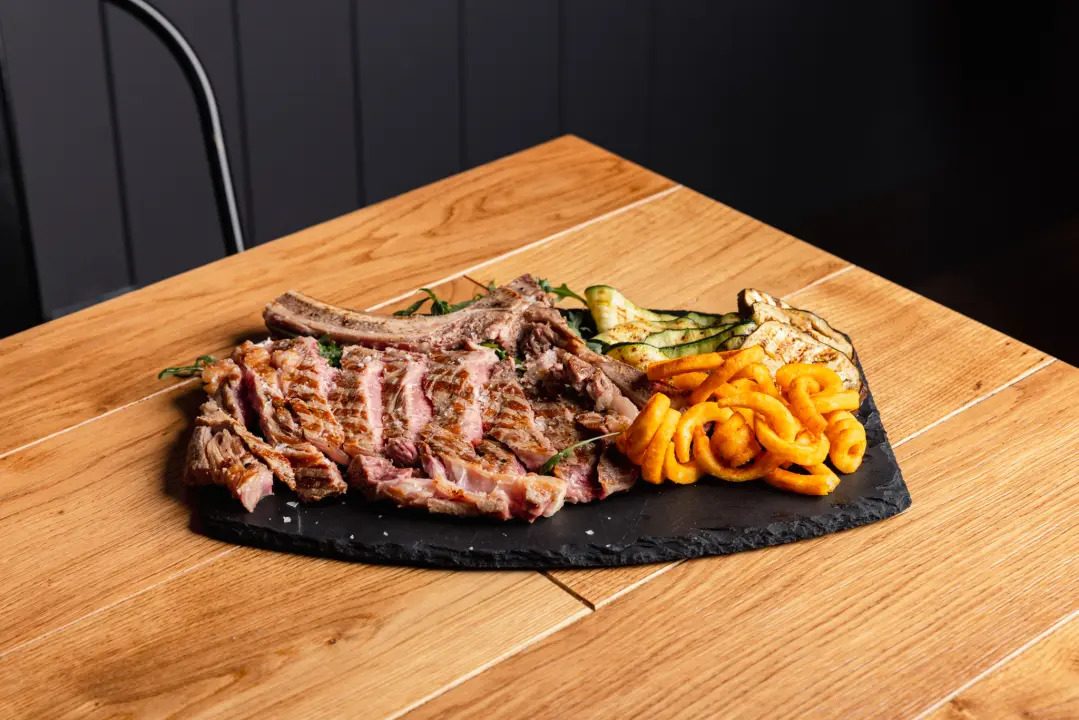 Costata di manzo alla griglia (circa 650 g), cottura decisa, sapore profondo, nessuna scorciatoia. Quando il Guardiano è davanti a te, non si discute. Si affronta. Contorno: Patate tagliate a ricciolo, con panatura speziata al chili e paprika Verdure grigliate (zucchine e melanzane)