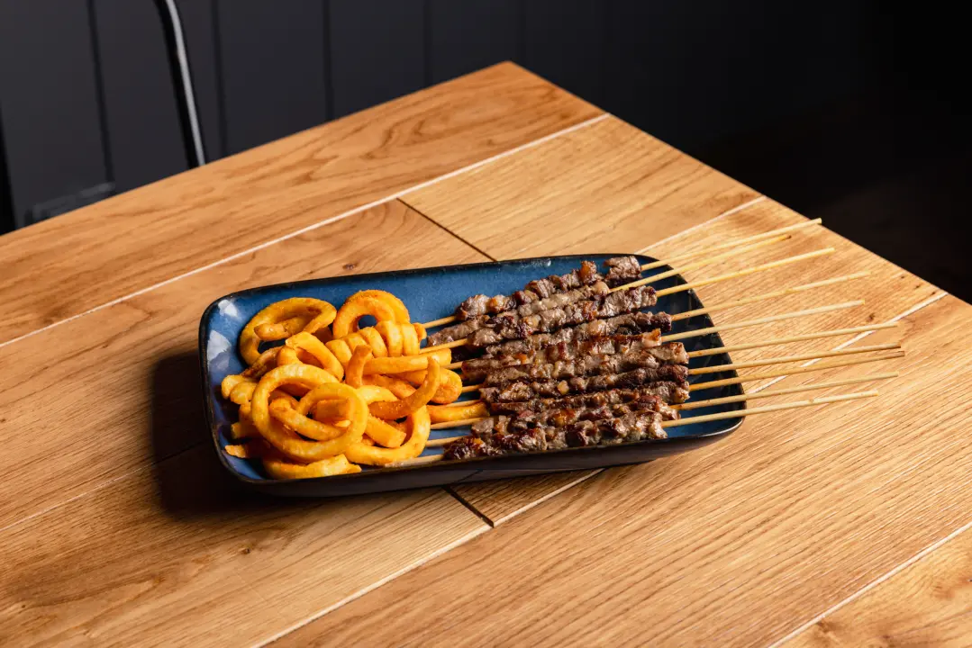 Arrosticini di pecora cotti alla griglia, diretti, intensi, senza filtri. Dieci spilli conficcati nella carne. Uno dopo l’altro. Fermarsi è l’errore. 🍽 Contorno incluso Patate tagliate a ricciolo, con panatura speziata al chili e paprika