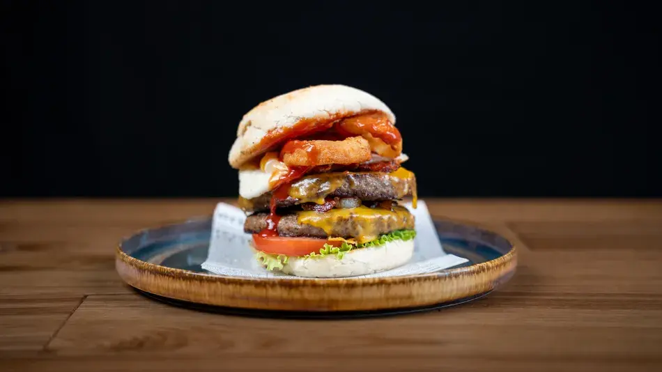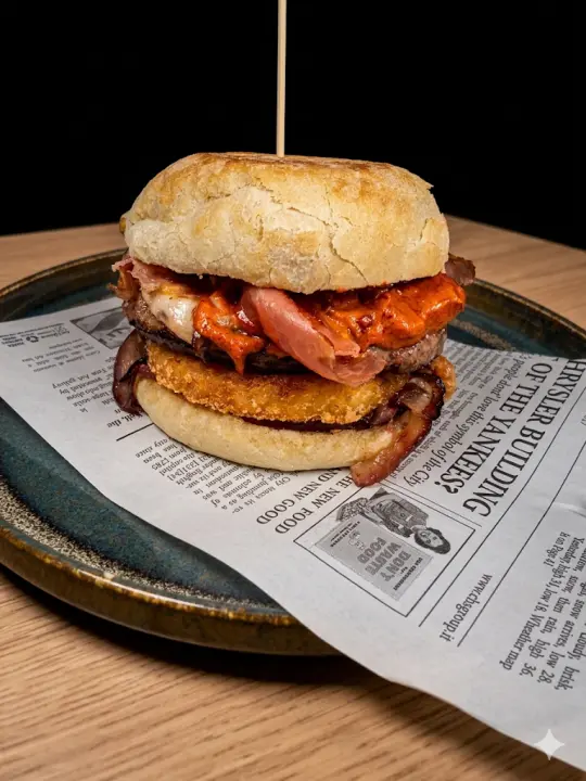 Alcuni entrano nel Sottosopra. Altri lo sfidano. Ma solo uno… lo domina. Due dischi di Scottona si scontrano in un bun artigianale che vibra sotto il peso della leggenda.In mezzo: uovo del risveglio, cheddar fuso come lava, bacon croccante come un Demogorgone sotto stress, lattuga e pomodoro freschi per non dimenticare il mondo di sopra.E poi lui: l’anello di cipolla dorato, sigillo sacro di questa sfida.A chiudere, una colata di salsa BBQ oscura. Solo chi riesce a finirlo… potra'