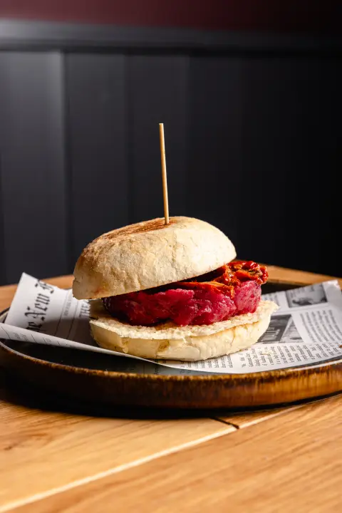 Un’apertura rara. Da attraversare solo quando tutto è pronto. Tartare di manzo da 180 grammi cialda di pecorino croccante al pepe, pomodori secchi e un filo di olio extravergine a chiudere il cerchio. Nessuna carne cotta. Nessuna salsa a coprire. Qui il panino diventa rito. Il Portale Rosso non si addomestica. Si attraversa una sola volta. E poi lo ricordi.