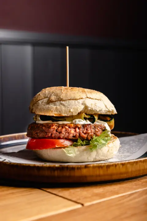 hamburger di manzo, insalata, pomodoro.