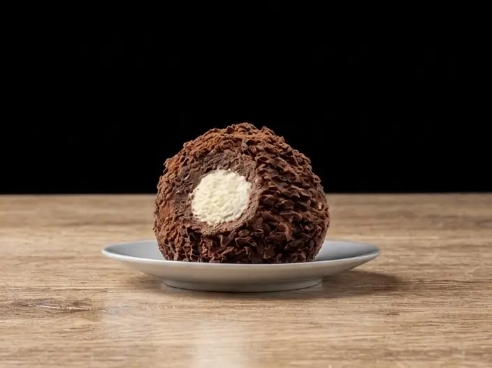 Un tartufo nero al cioccolato che racchiude un cuore di gelato alla crema, freddo e vellutato. Scuro, intenso e inaspettato: un piccolo lancio nel Sottosopra.