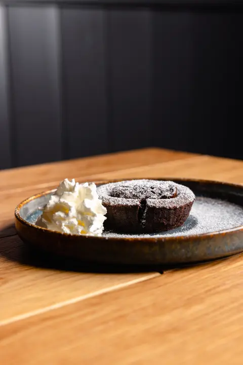 Tortino al Cioccolato dal cuore caldo e fondente. Servito con zucchero a velo e ciuffetto di Pannna montata.