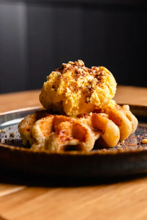 Il classico dolce ottenuto nelle forme a nido d'ape, arrichito con sciroppo d'acero oppure nutella e servito con gelato alla Crema, granella di nocciole e crumble di biscotto al cacao.
