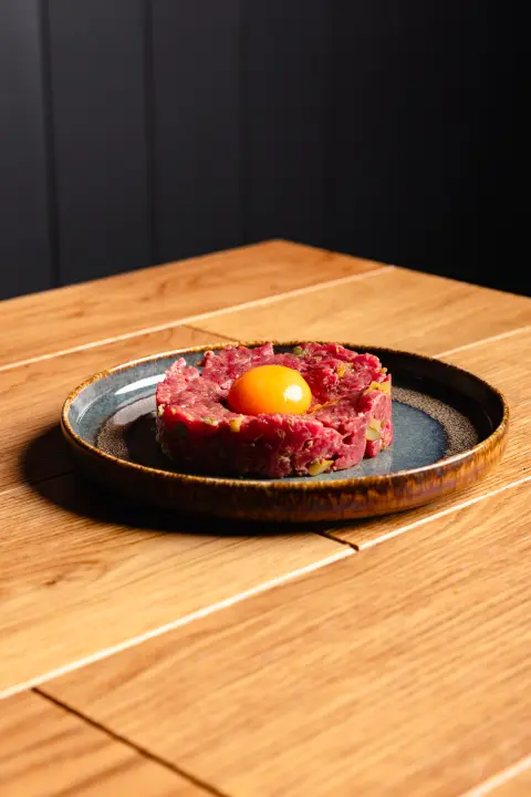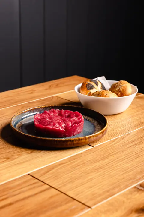 Tartare di manzo da 180 gr, condita con cetriolino, capperi, senape, salsa Worcestershire, tuorlo d’uovo, olio extravergine, sale e pepe. Servita con mini paninetti croccanti. Il primo segnale è sempre quello giusto. Pulito. Diretto. Inequivocabile.