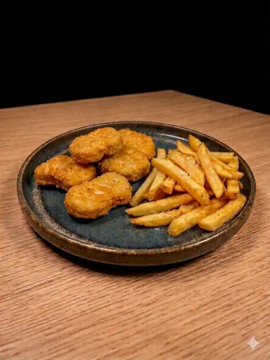 Nuggets di pollo, patatine fritte, bibita.